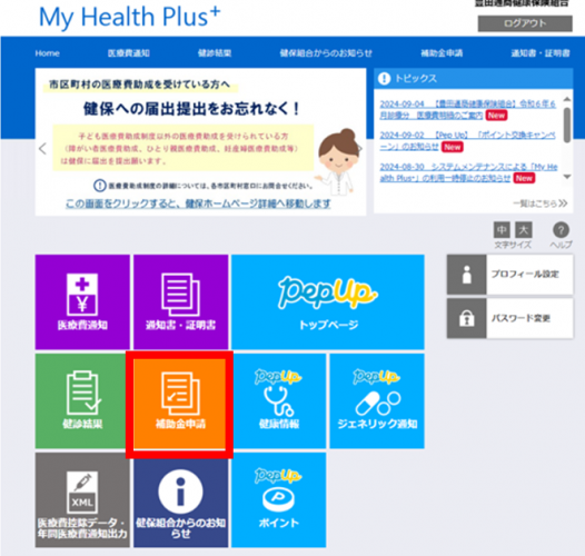 My Health Plus+の「補助金申請」のタイルからご申請ください。